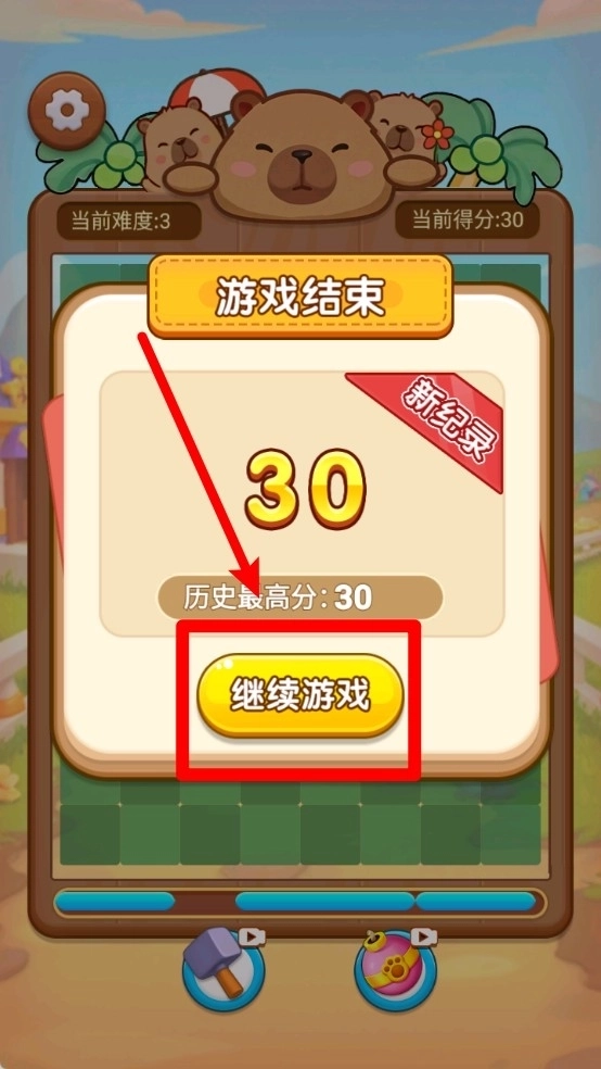 当棋盘上再也放不下任何方块时游戏就会结束,此时可以点击“继续游戏”按钮来接着游玩。