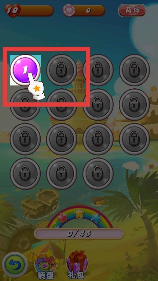 在游戏的关卡选择界面,只要点击未锁定的关卡按钮,就能进入相应关卡;界面顶部会显示当前持有的步数道具数量以及爱心数量。