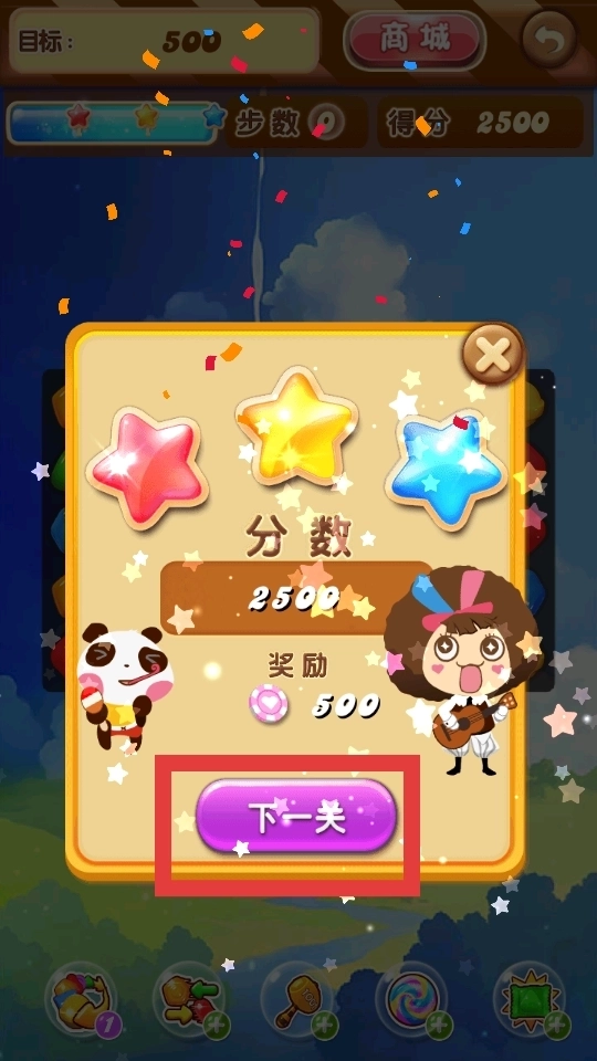 在规定步数内成功达成目标分数后,系统会依据消除时的表现给予对应的分数与奖励;领取奖励后,点击下一关按钮即可进入下一关。
