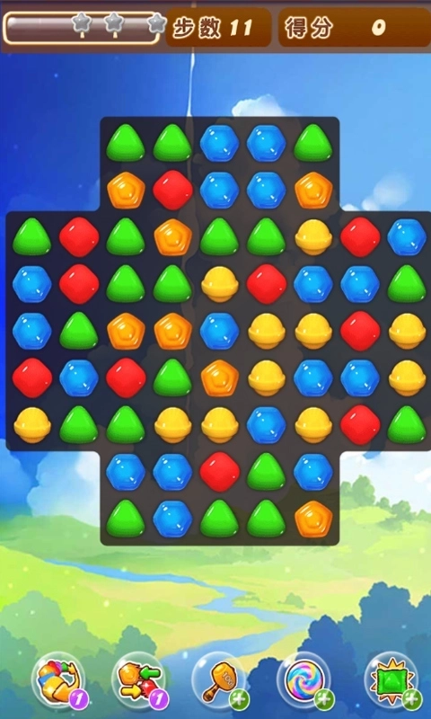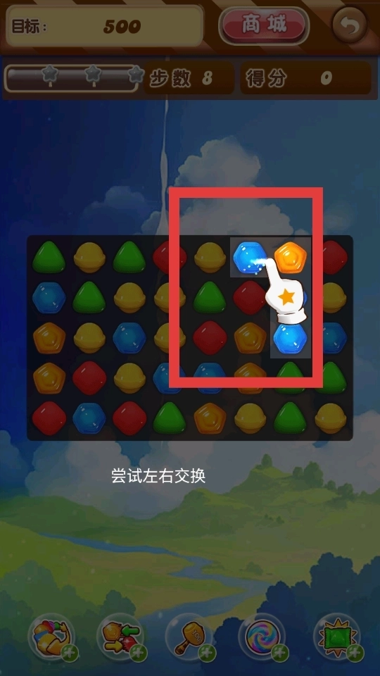 进入关卡后,点击相邻糖果交换它们的位置,只要让三个或三个以上同色糖果连成一条直线,就能完成消除操作。