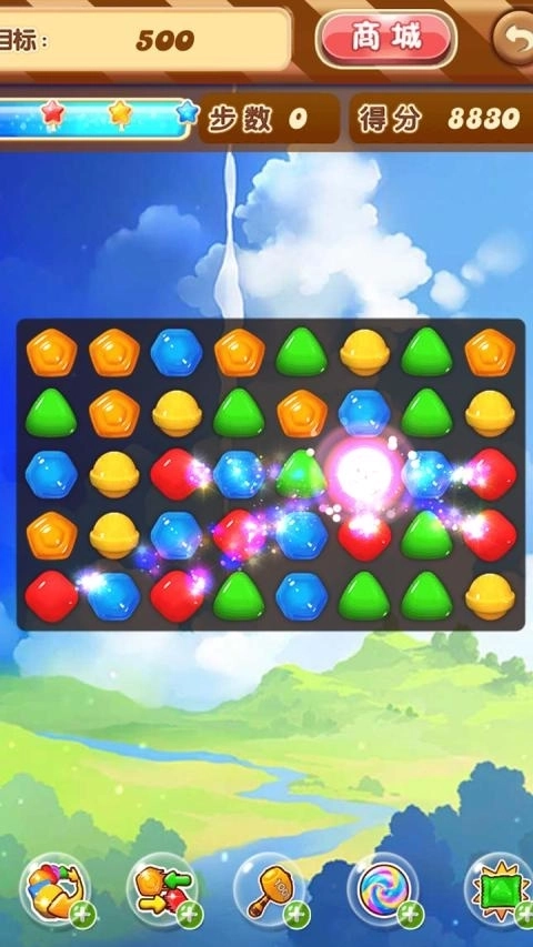 基础消除方法:只要匹配到三个相同颜色的糖果就能完成消除,T形和L形的匹配组合可以生成强力特效。建议优先处理底层的糖果,这样更容易触发连锁反应,从而获得更多的连击机会。