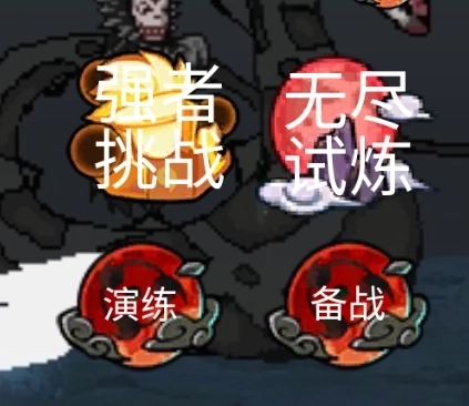 当玩家点击【开始游戏】后,可从四种模式里挑选,它们分别是强者挑战、无尽试炼、演练(即上方的对战练习)以及备战模式。