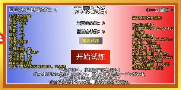 在无尽试炼里,获胜后能恢复生命值;点击中间的【开始试炼】按钮就行。