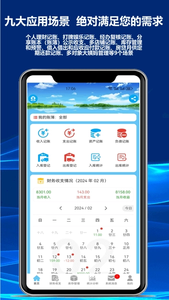 具有个人理财记账、打牌娱乐记账、经办复核记账、分享账本(账簿)公示收支、多店铺记账、库存管理和预警、借入借出和应收应付款记账、房贷月供定期还款记账、多对象例假管理等九大应用场景。