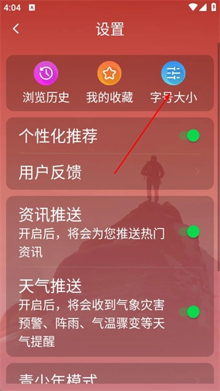 进入大字看天下后,点击右上角的设置按钮,就能进入设置页面。