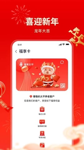 2、福享太平具备福享太平分享春节喜悦这一功能。借助该功能,用户不仅能够知晓福享太平的福利活动,还能传递太平祝福。