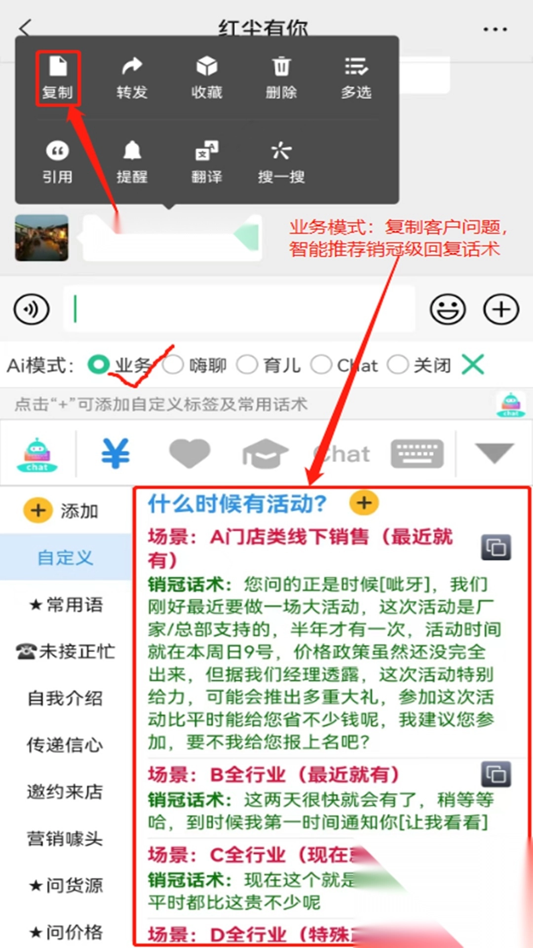 【复制生成模式】 1. **业务模式**:复制客户所提问题,系统智能推荐营销回复话术。 2. **嗨聊模式**:复制对方所说的话,系统智能推荐恋爱回复话术,同时附上♫歌词。 3. **育儿模式**:复制聊天语句,系统智能推荐“英汉翻译、诗词、成语接龙、历史上的今天”相关内容。