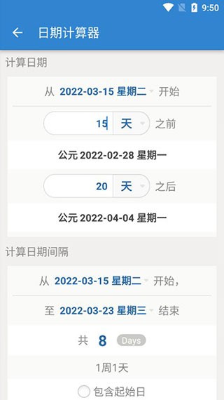 3、在倒数本页面中的日期计算器,可以计算日期和时间间隔。