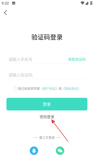 2、在登录页面,可使用验证码登录,也可点击密码登录切换登录方式。
