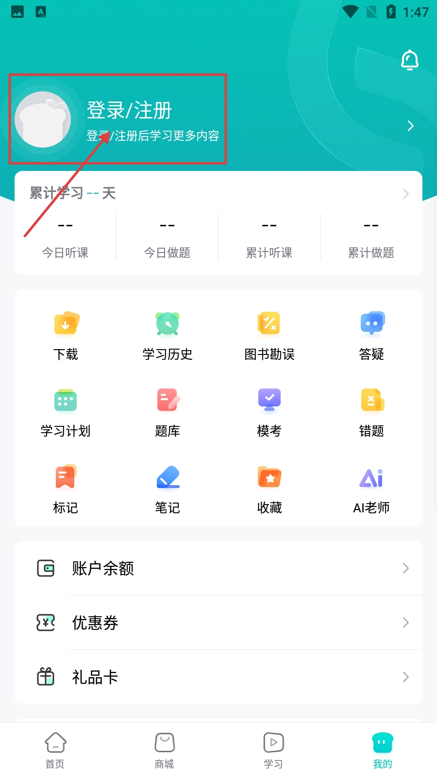 在“我的”页面,点击“登录/注册”按钮,登录成功后就能浏览和学习更多内容。