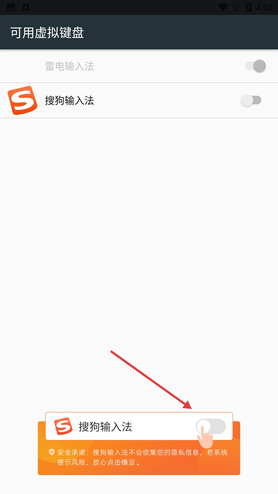 在【可用虚拟键盘】页面中,找到【搜狗输入法】这一选项,然后点击该选项右侧的开关按钮,将其切换至开启状态。