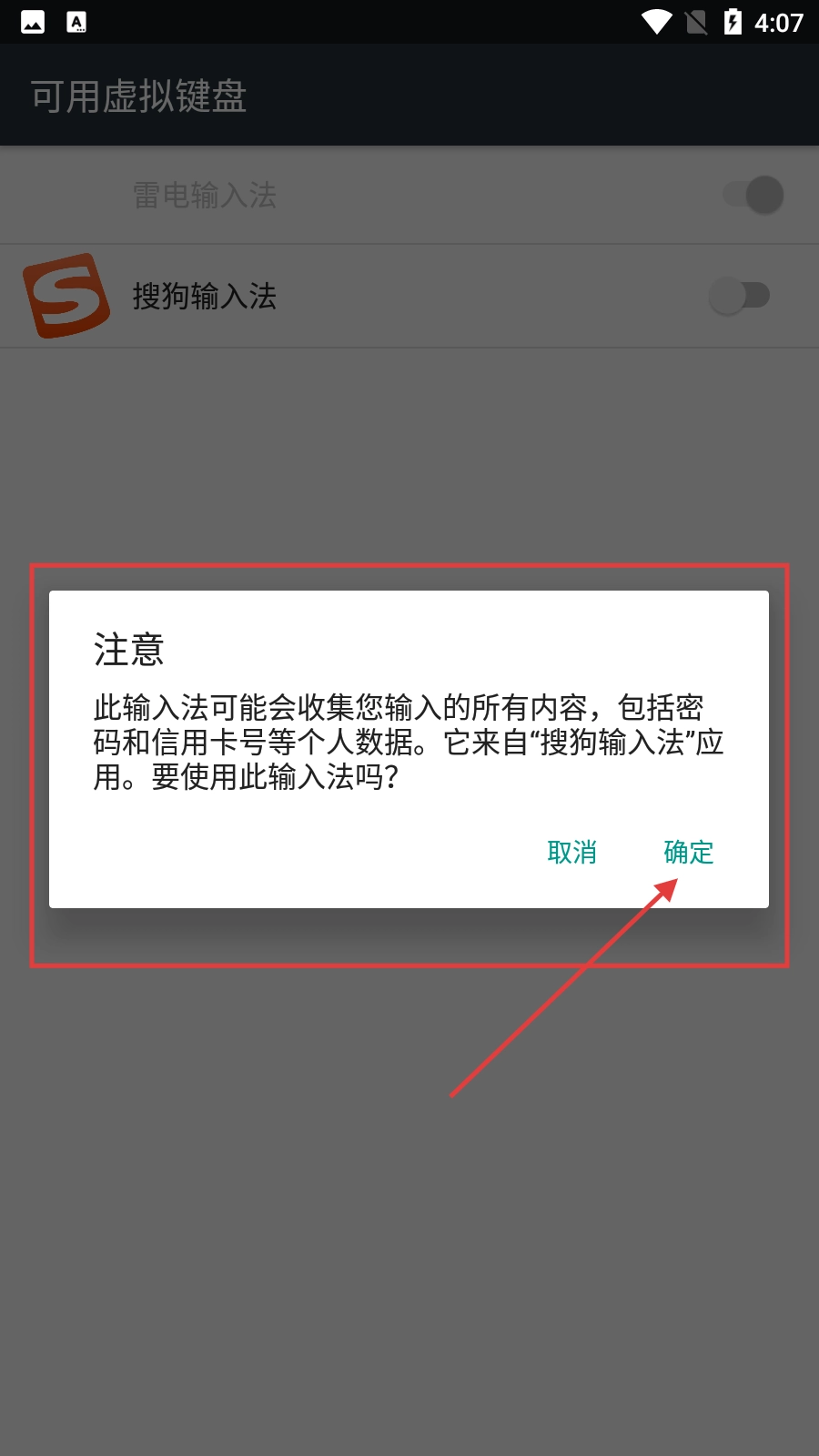 开启该功能后会弹出提示框,告知输入法可能会收集输入内容,点击【确定】按钮即可继续使用。