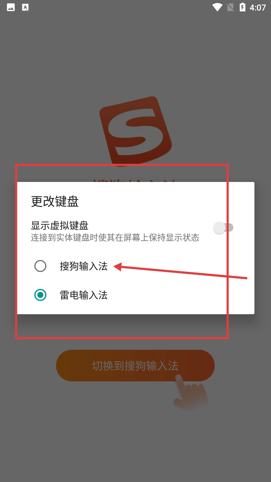 在【更改键盘】页面,选择【搜狗输入法】选项,就能完成搜狗输入法的切换设置。