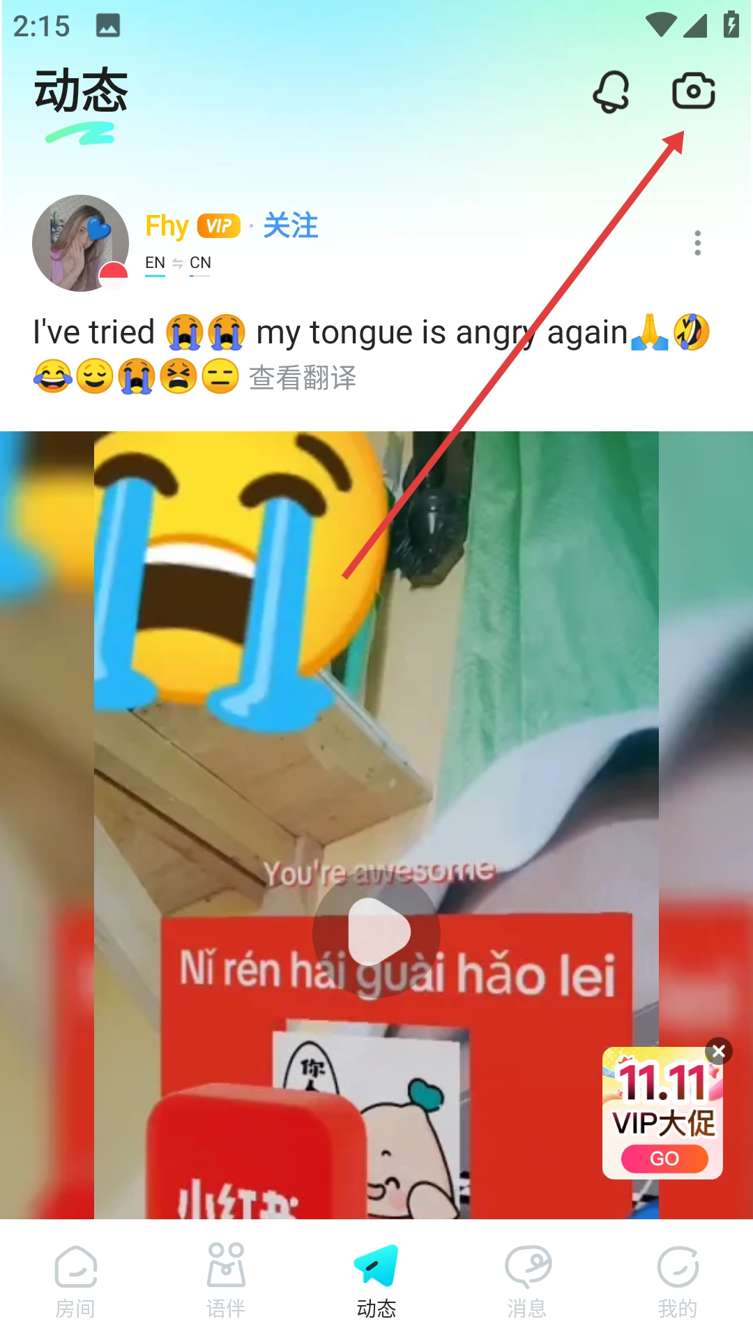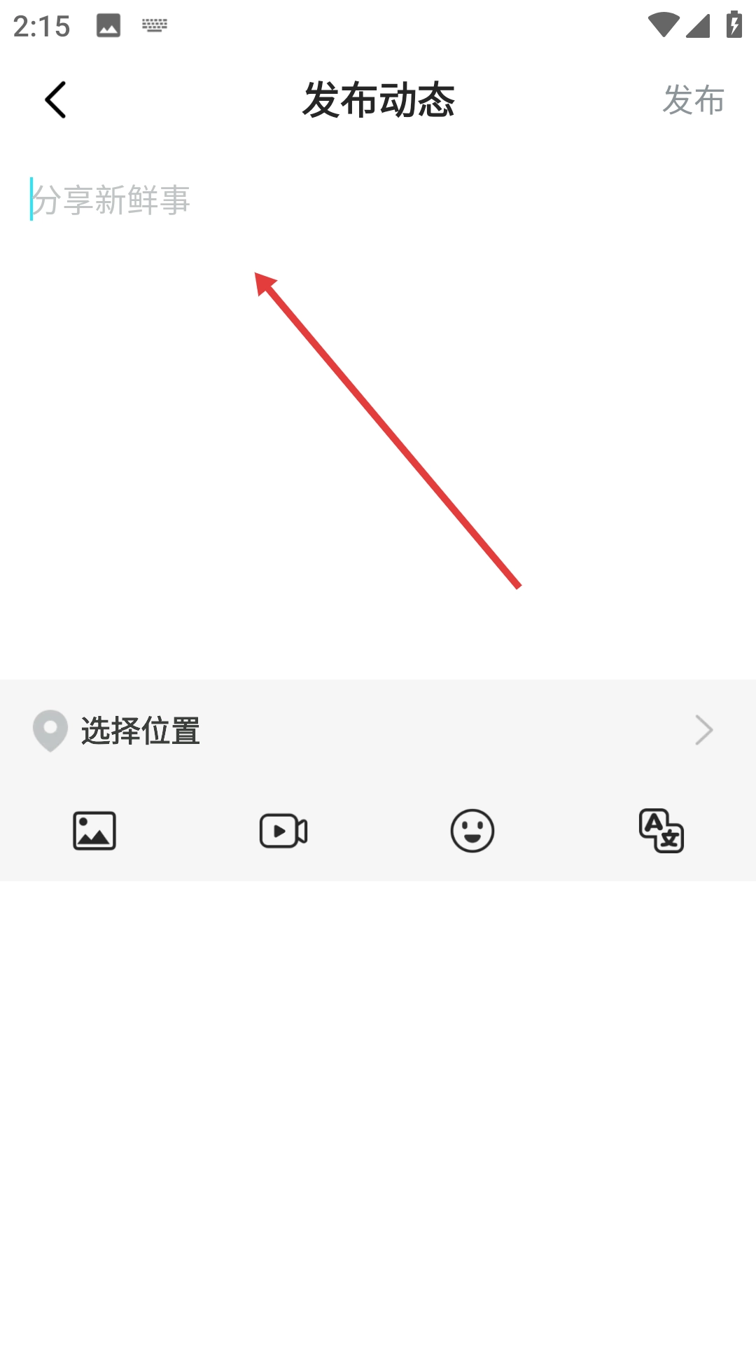 在动态页面中点击右上角的相机图标,即可进入发布动态的页面。