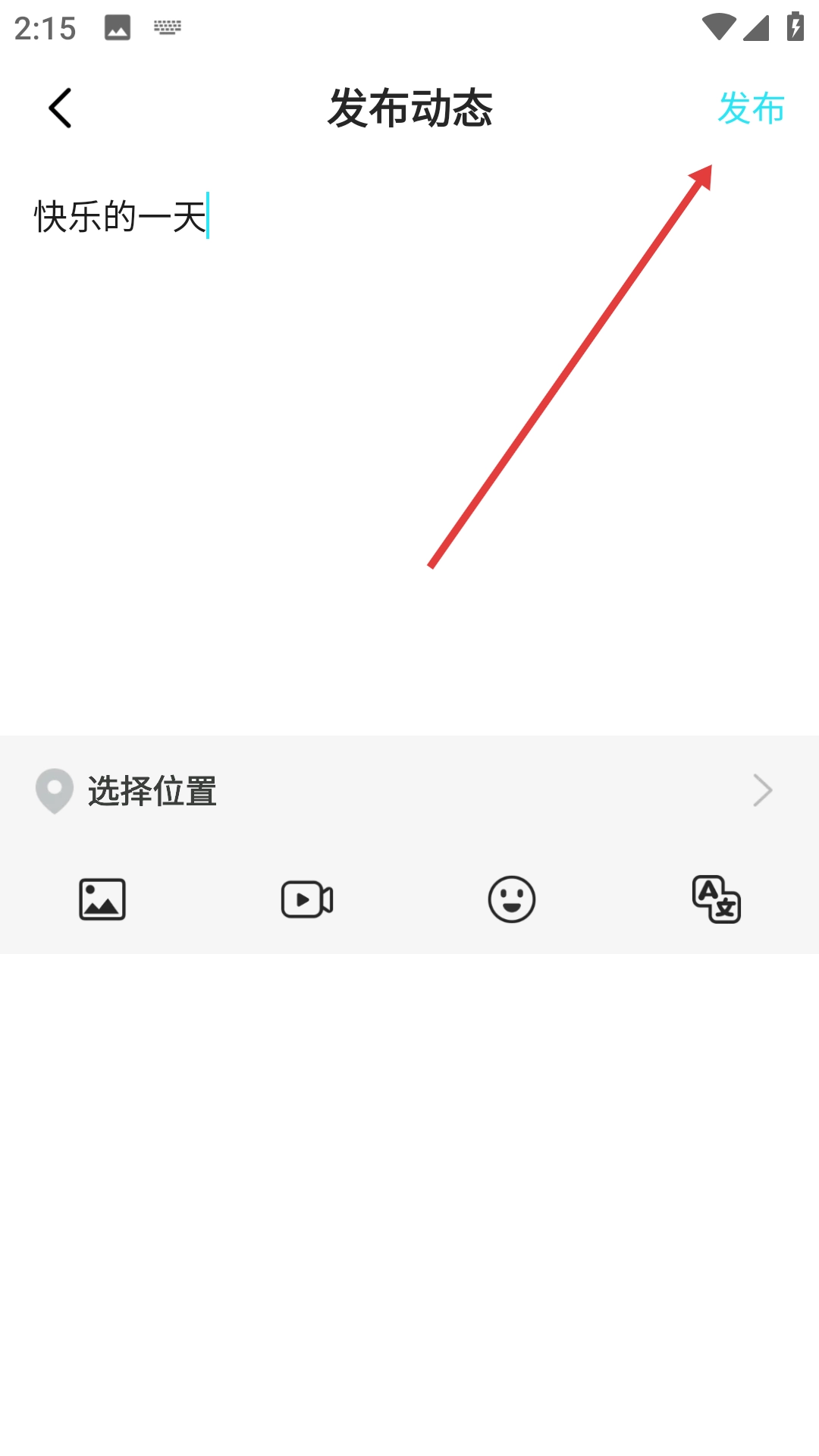 在发布动态的页面里输入想要分享的内容,例如【快乐的一天】。