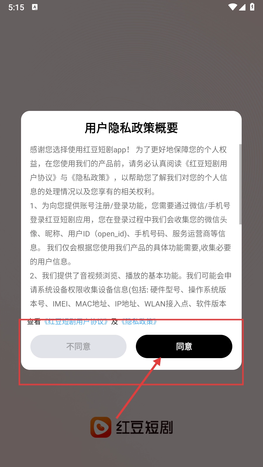 在红豆短剧的【用户隐私政策概要】页面,点击【同意】按钮后,即可进入主界面。