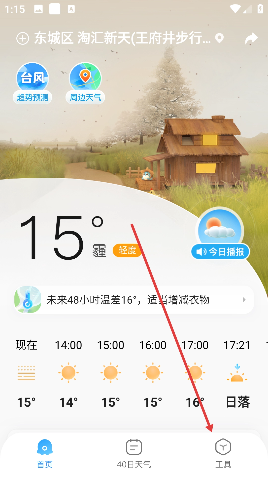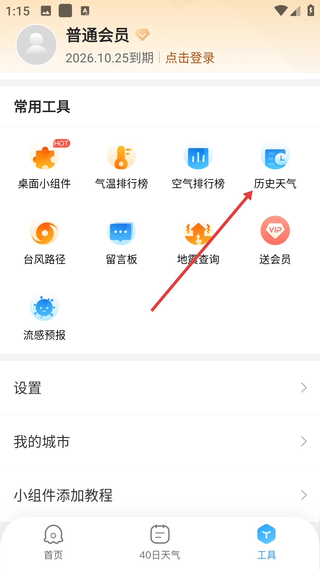 点击底部的【工具】按钮,进入工具页面后,就能看到历史天气、台风路径等常用工具的功能入口了。