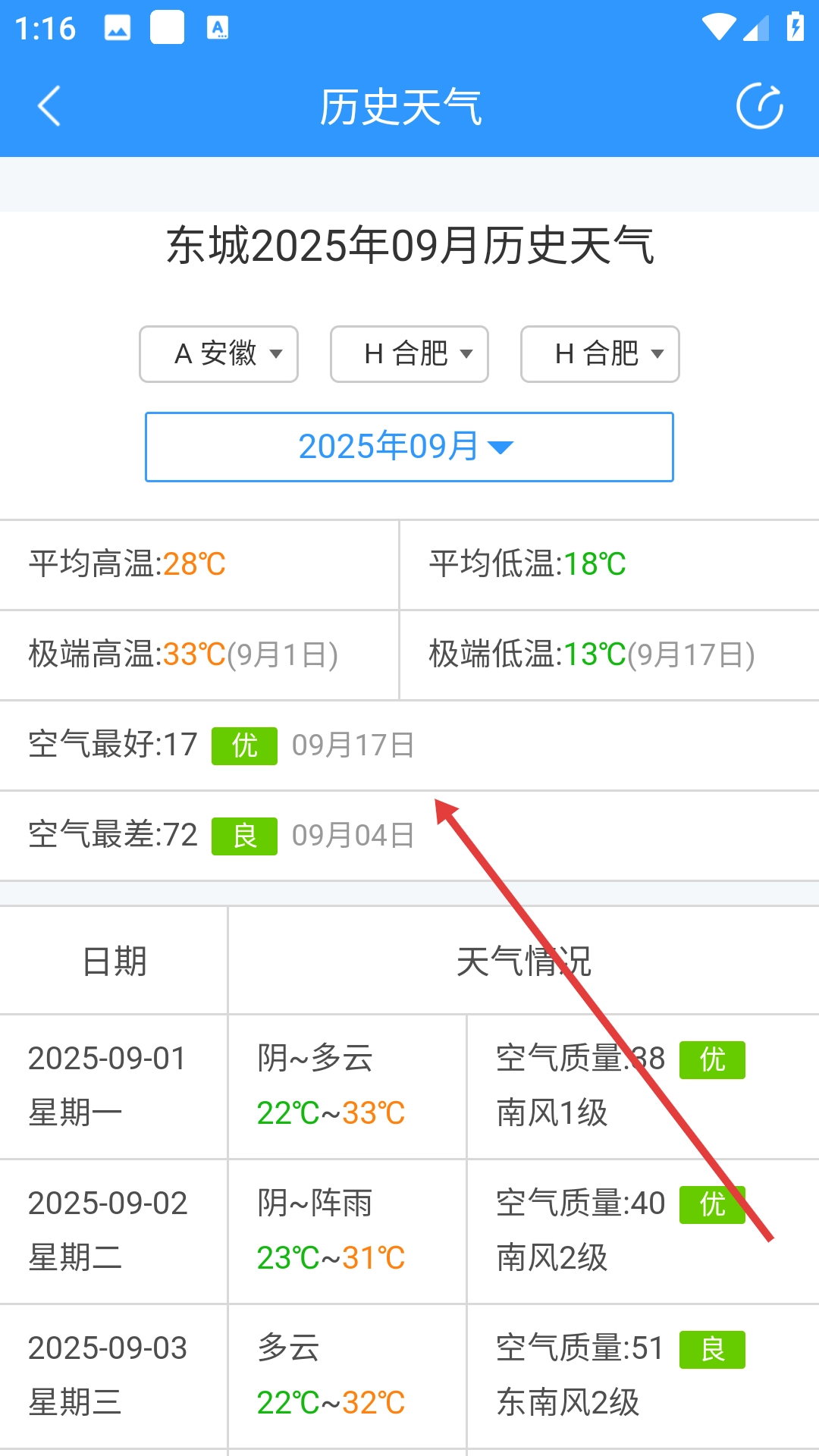 在历史天气详情页面可以查询到东城2026年9月的平均温度、极端温度以及空气质量等历史天气相关信息。