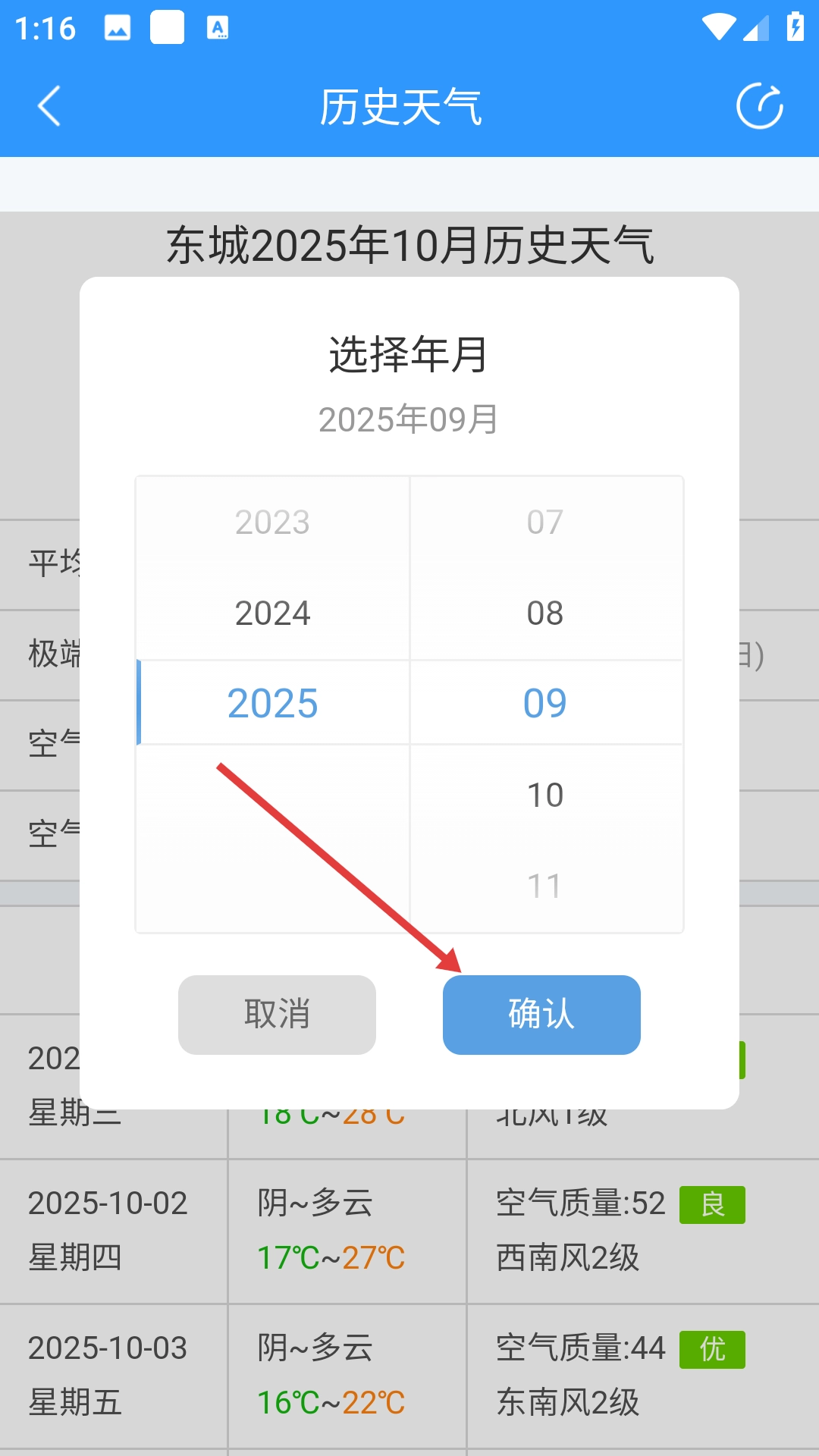 在选定年月后,点击【确认】按钮,即可进入该具体月份的历史天气详情页面。