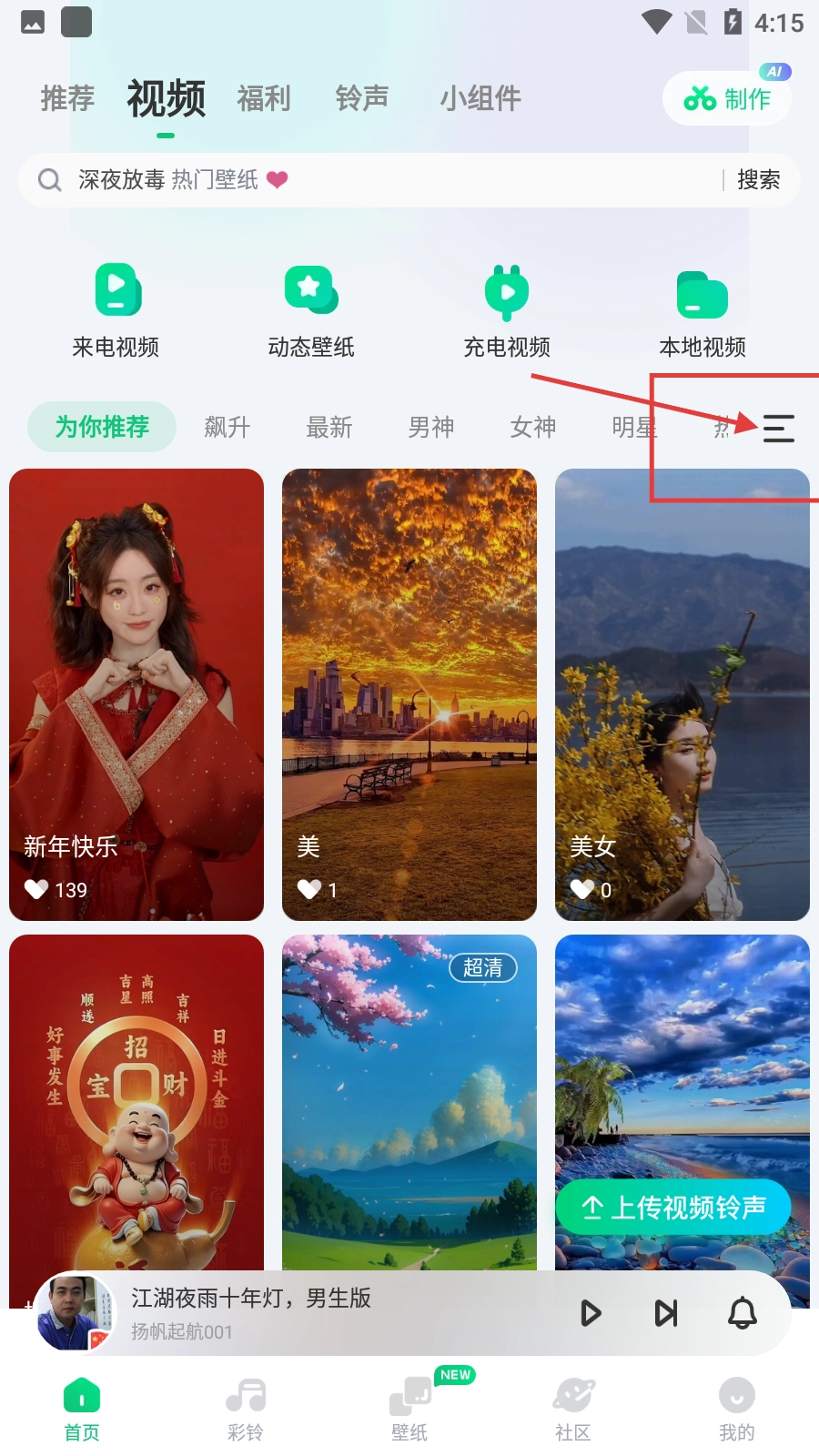 在视频页面,点击分类按钮(三条横线图标),展开分类列表。