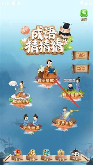 在【成语猜猜猜】游戏的主界面中,找到并点击【看图猜成语】的功能入口,就能进入关卡选择页面,开启成语猜谜的挑战之旅。