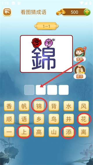在答题界面,依据图片与汉字提示,挑选像【锦】【上】【添】【花】这类汉字,组合成正确的成语来完成答题。