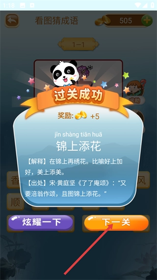 成功通过当前关卡后,点击【下一关】按钮,就能继续挑战后面的成语关卡,并且可以获得金币奖励。