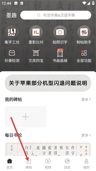 打开墨趣应用后,点击底部导航栏中的【碑帖】选项,即可进入碑帖板块,在该板块内可以查看所有碑帖资源以及相关的功能选项。
