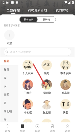 在碑帖板块中,找到书法家【欧阳询】并点击,就能进入他的碑帖列表页面,查看相关的碑帖资源。