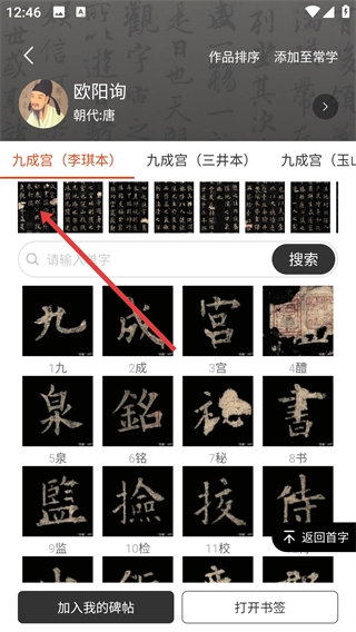 在欧阳询碑帖列表里,点击【九成宫(李琪本)】对应的碑帖内容,就能进入该碑帖的详细页面。