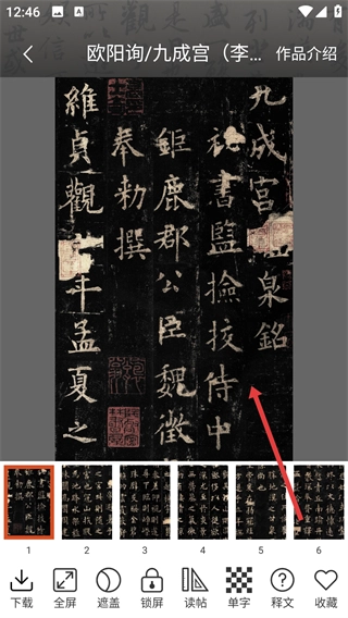 进入九成宫碑帖详细页面后,不仅能查看高清碑帖内容,还能借助【】【全屏】等功能辅助书法学习。