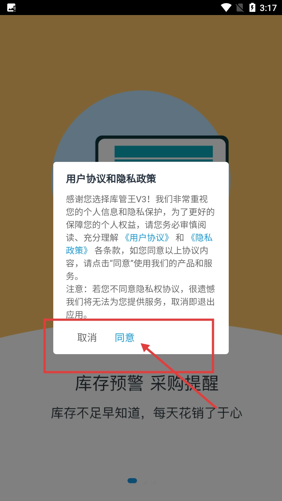 在【库管王V3】的用户协议与隐私政策弹窗界面,点击【同意】按钮后,即可进入后续操作流程。