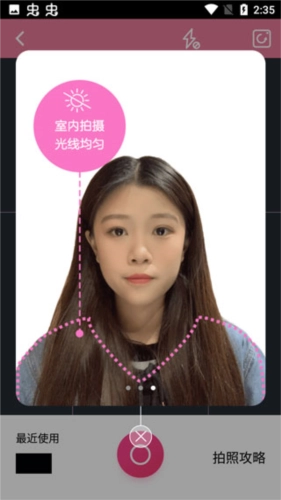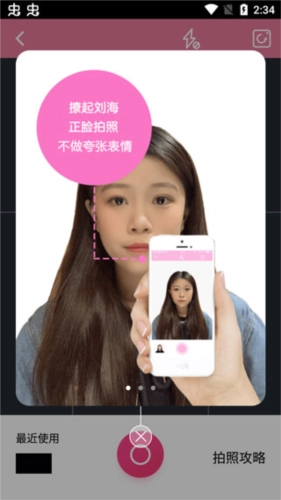 撩起刘海,正脸拍照,不做夸张表情