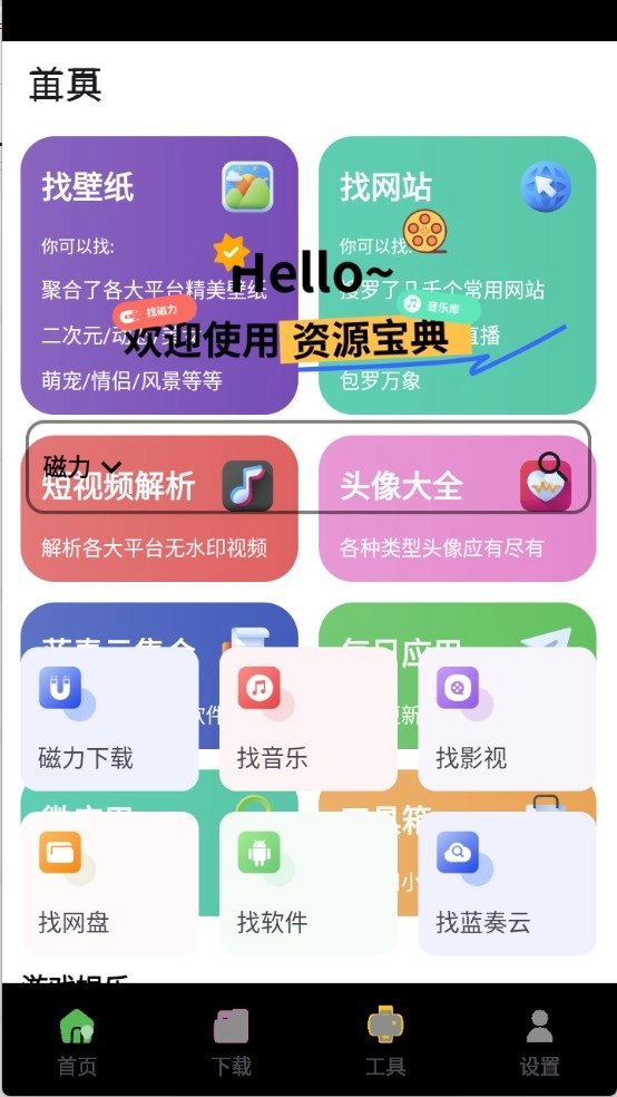 进入“工具”页面后,能看到短视频解析、表情包、壁纸等多种工具。
