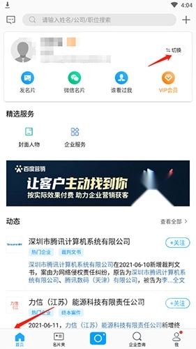 打开名片全能王应用,先点击“首页”选项,接着点击“切换”按钮。