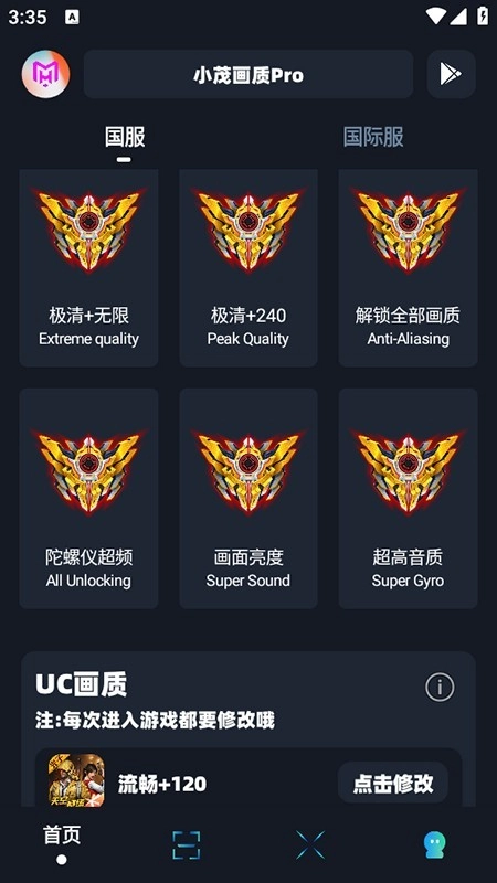 在本站内完成软件的安装与启动后,于首页界面选择“国服”或者“国际服”的运行模式。