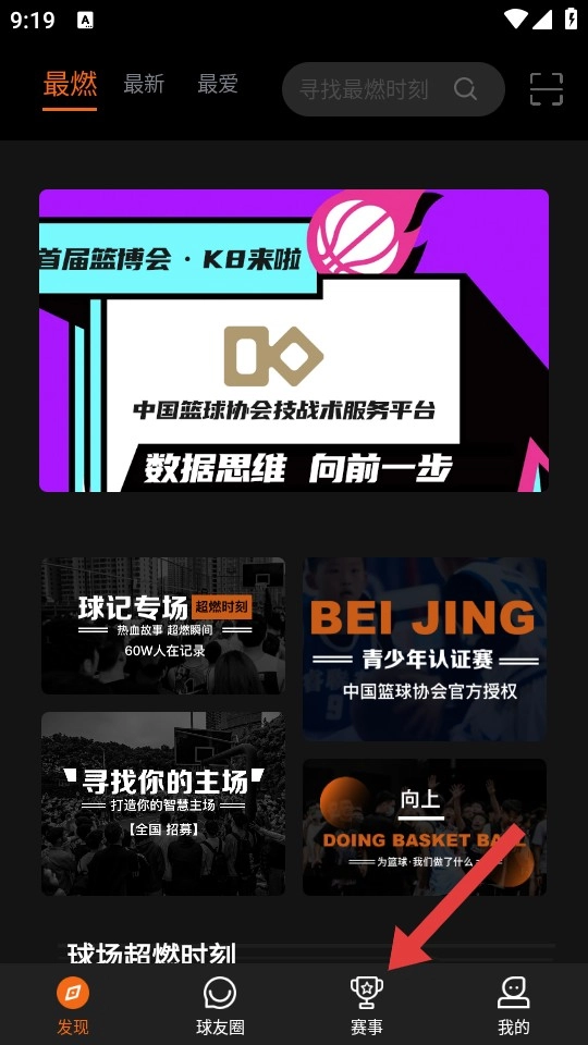 打开球记应用,点击底部导航栏中的【赛事】选项,即可进入赛事页面。