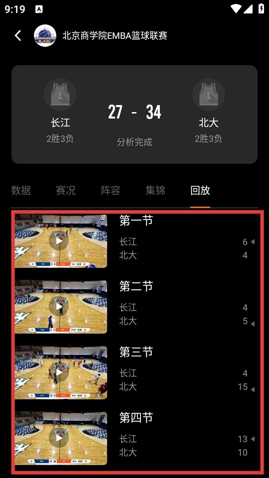 在回放界面,您可以选择对应节次的视频,点击播放按钮就能观看赛事回放内容。