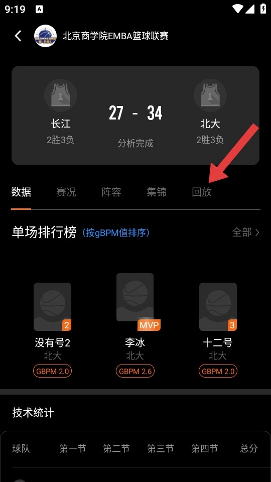 进入赛事详情页后,点击上方的【回放】选项。