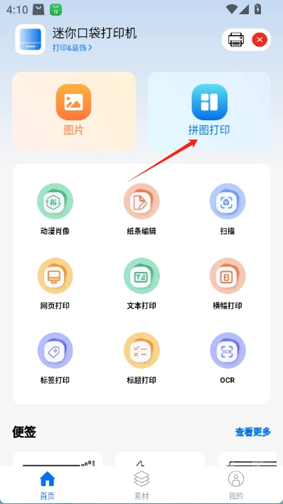 安装并打开叮当小印,选择你想要的打印功能,魔趣网(m.mfunz.com)为大家演示拼图打印的操作