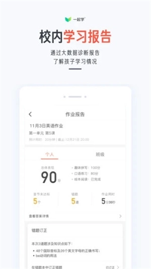 学习报告:校内作业与学习能力测评的反馈信息,可随时查看孩子的学习动态及作业成绩,了解知识点的掌握状况,孩子的进步或退步情况都能及时知晓。