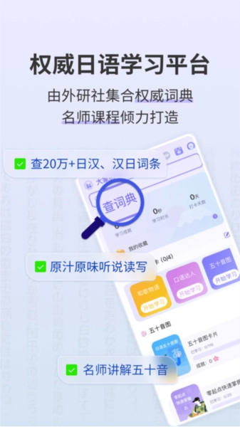 外研社与海笛联手打造的诚意之作《大家的日语》,不仅为学习者提供地道发音指导与实用口语训练,还借助丰富的和歌赏析及权威词库,助力深入领略日本文化精髓。内容覆盖从入门级五十音图到专业领域财务知识等多元模块,满足不同阶段学习需求。产品版本持续迭代更新,致力于优化用户学习体验。诚邀您即刻加入,一同开启这段精彩充实的日语学习之旅!