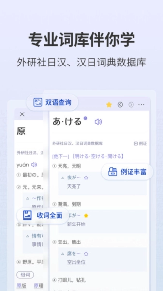 提供日汉、汉日双向查词功能,结合智能联想技术,可一站式检索词目、短语及例句。