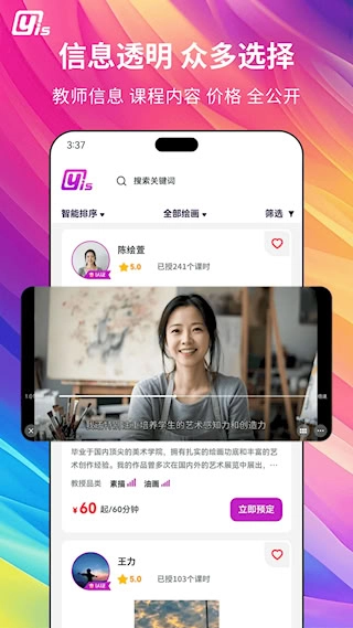 Yis具备课程搜索与教师展示的功能,用户可以依据艺术门类、价格范围、授课方式来筛选内容。教师端支持上传作品集和教学视频,学习者则能够直接发送咨询信息或者预约试听课。课程详情页面涵盖了完整的大纲以及学员的评价内容。