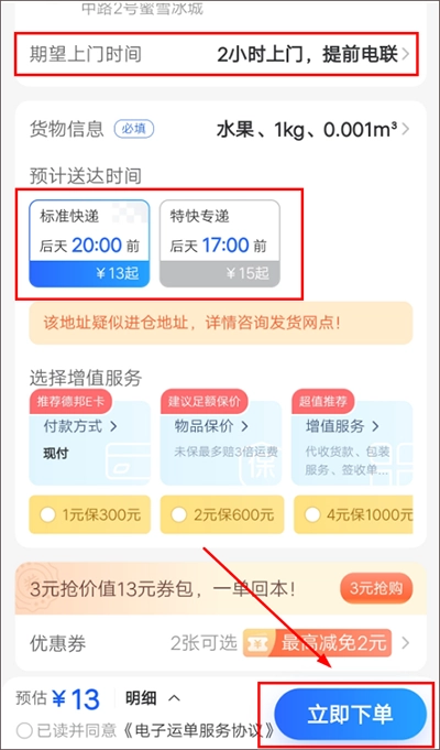 在【寄快递】页面,填写寄件地址、收件地址以及货物相关信息。信息填写完毕后,从标准快递、特快专递这两种寄件方式里进行选择。接着确定快递员上门取件的时间,等上述所有内容都填写好,点击【立即下单】按钮,快递下单操作就完成了,之后只需耐心等待快递员联系您上门取件就行。