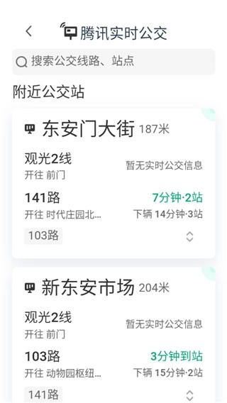 在实时公交功能里,我们还可以查看自己周边的公交站点信息和车辆到站时间,这样能更方便地安排乘车。