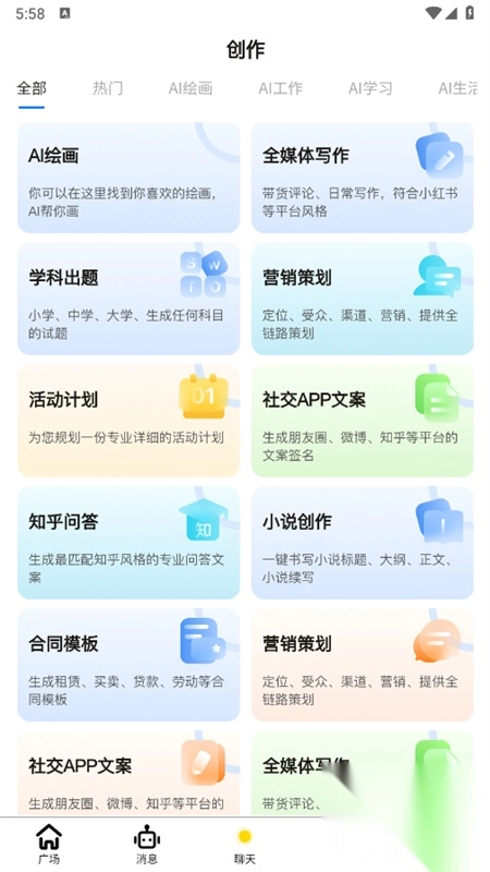 4、点击“创作”,在此处,为大家准备了AI绘画、全媒体写作、工作汇报等诸多实用功能。
