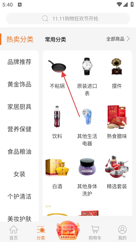 在商品分类页面点击【不粘锅】分类,就能进入不粘锅商品的列表页面。