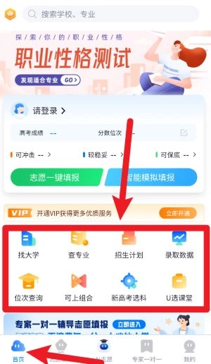 点击首页即可快速进入找大学、查专业、招生计划、录取数据等多个高考相关功能入口,从而提升填报效率。
