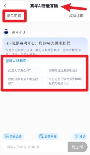 AI志愿页面设有高考智能答疑功能,用户既能点击常见问题查看解答,也能输入个性化问题以获取智能支持。
